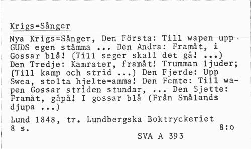 //// Krigs=Sånger //// Nya Krigs=Sånger, Den Första: Till wapen upp ¦ GUDS egen stämma ... Den Andra: Framåt, i Gossar blå! (Till seger skall det gå! ...) Den Tredje: Kamrater, framåt.' Trumman ljuder; (Till kamp och strid ...) Den Fjerde: Upp Swea, stolta njelte=ammaJ Den Femte: Till wapen Gossar striden stundar, ... Den Sjette: Framåt, gåpå! I gossar blå (Från Smålands djupa ...) //// Lund 1848, tr. Lundbergska Boktryckeriet 8 s. 8:0 //// SVA A 39 3 ////