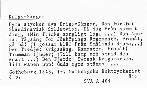//// Krigs=Sånger //// Fyra stycken nya Krigs=Sånger, Den Första: Skandinavisk Soldatvisa. Då jag från hemmet drog, (Min flicka sorgligt log, ...) Den Andra: Tågsång för Jönköpings Regemente. Framåt, gå på! (I gossar blå I Från Smålands djupa...J Den Tredje: Krigssång. Kamrater, framåt! Trumman ljuder; (Till kamp och strid den snart ...) Den Fjerde: Swensk Krigsmarsch. Till wapen upp! Guds egen stämma, ... //// Götheborg 1848, tr. Norbergska Boktryckeriet 8 s. 8so //// SVA A 404 ////