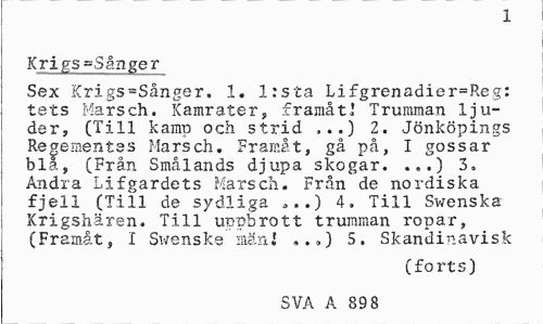 //// 1 //// Krigs-Sånger //// Sex Krigs-Sånger. 1. lista Lifgrenadier=Reg: tets Marsch. Kamrater, framåt.1 Trumman ljuder, (Till kamp och strid ,..) 2. Jönköpings Regementes Marsch. Framåt, gå på, I gossar blå, (Från Smålands djupa skogar. .,.) 3» Andra Lifgardets Marsch. Från de nordiska fjell (Till de sydliga »..) 4. Till Swenska Krigshären. Till uppbrott trumman ropar, (Framåt, I Swenske män! *.<,) 5. Skandinavisk //// (forts) //// SVA A 89 8 ////