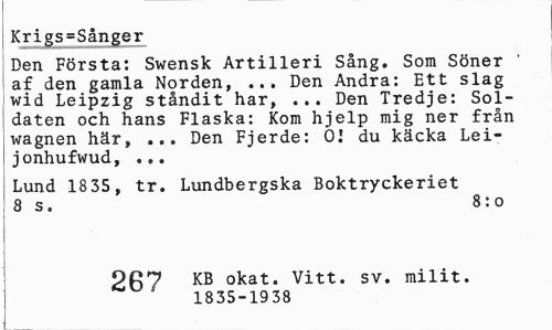 //// Krigs=Sånger //// Den Första: Swensk Artilleri Sång. Som Söner ' af den gamla Norden, ... Den Andra: Ett slag wid Leipzig ståndit har, ... Den Tredje: Soldaten och hans Flaska: Kom hjelp mig ner från wagnen här, ... Den Fjerde: 01 du käcka Lei-jonhufwud, ... //// Lund 18 35, tr. Lundbergska Boktryckeriet 8 s. 8: o //// i 2/7 k B okat. Vitt. sv. milit. //// 1835-1938 ////