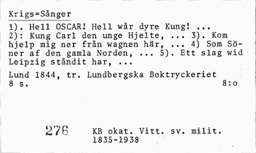 //// Krigs=Sånger //// 1). Hell OSCAR! Hell wår dyre Kung! ... //// 2): Kung Carl den unge Hjelte, ... 3). Kom hjelp mig ner från vagnen här, ... 4) Som Söner af den gamla Norden, ... 5). Ett slag wid Leipzig ståndit har, ... //// Lund 1844, tr. Lundbergska Boktryckeriet 8 s. 8:o //// oQf? KB okat. Vitt. sv. ailit. //// 1835-1938 ////