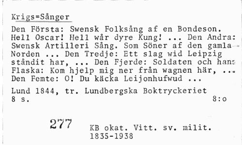 //// Krigs=Sånger //// Den Första: Swensk Folksång af en Bondeson. Hell Oscar! Hell wår dyre Kung.' ... Den Andra; Swensk Artilleri Sång. Som Söner af den gamla --» Norden ... Den Tredje: Ett slag wid Leipzig ståndit har, ... Den Fjerde: Soldaten och hans Flaska: Kom hjelp mig ner från wagnen här, . ., Den Femte: 01 Du käcka Leijonhufwud ... //// Lund 1844, tr. Lundbergska Boktryckeriet 8 s. 8 : o //// i 2/7 k B okat. Vitt. sv. milit. //// 1835-1938 ////