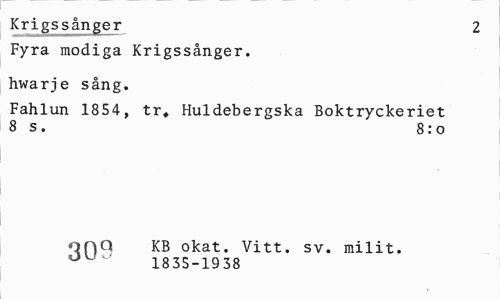 //// Krigssånger 2 //// Fyra modiga Krigssånger. //// hwarje sång. //// Fahlun 1854, tr. Huldebergska Boktryckeriet 8 s. 8: o //// nnQ KB okat. Vitt. sv. milit. //// 1835-19 38 ////