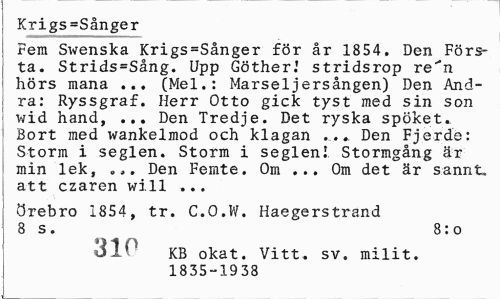 //// Krigs=Sånger //// Fem Swenska Krigs=Sånger för år 1854. Den Första. Strids=Sång. Upp Göther.' stridsrop re^n hörs mana ... (Mel.: Marseljersången) Den Andra: Ryssgraf. Herr Otto gick tyst med sin son wid hand, ... Den Tredje. Det ryska spöket.. Bort med wankelmod och klagan ... Den Fjerdo: Storm i seglen. Storm i seglen! Stormgång är min lek, ... Den Femte. Om ... Om det är sannt. att czaren wi.ll ... //// Örebro 1854, tr. C.O.W. Haegerstrand 8 s. 8:o //// i 2/7 k B okat. Vitt. sv. milit. //// 1835-1938 ////