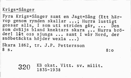//// Krigs=Sånger //// Fyra Krigs=Sånger samt en Jagt=Sång (Ett härrop genom rymden skallar .Hurra lustigt gossar alla, I som uti striden går, ... Den som dväljs bland knektars skara ... Hurra bröder! låt oss sjunga ... samt I wår Nord, der snöbetäckta höjder wexla ...) //// Skara 1862, tr. J.P. Pettersson 8 s. 8:0 //// oon KB okat. Vitt. sv. milit. //// 1835-1938 //// I ////