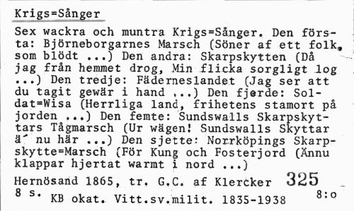 //// Krigs=Sånger //// Sex wackra och muntra Krigs=Sånger. Den första: Björneborgarnes Marsch (Söner af ett folk, som blödt ...) Den andra: Skarpskytten (Då jag från hemmet drog, Min flicka sorgligt log ...) Den tredje: Fäderneslandet (Jag ser att du tagit gewär i hand ,..) Den fjerde: Sol-dat=Wisa (Herrliga land, frihetens stamort på jorden ...) Den femte: Sundswalls Skarpskyttars Tågmarsch (Ur wägenl Sundswalls Skyttar ä' nu här ...) Den sjette-' Norrköpings Skarp-skytte=Marsch (För Kung och Fosterjord (Ännu klappar hjertat warmt i nord ...) //// Hernösand 1865, tr. G.C. af Klercker 325 //// 8 s* KB okat. Vitt.sv.milit. 1835-1938 ////