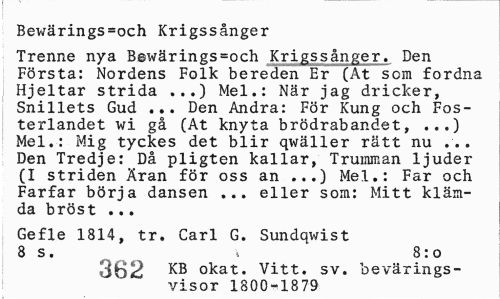 //// Rewärings=och Krigssånger //// Trenne nya Bewärings=och Krigssånger. Den Första: Nordens Folk bereden Er (At som fordna Hjeltar strida ...) Mel.: När jag dricker, Snillets Gud ... Den Andra: För Kung och Fosterlandet wi gå (At knyta brödrabandet, ...) Mel.: Mig tyckes det blir qwäller rätt nu ... Den Tredje: Då pligten kallar, Trumman ljuder (I striden Äran för oss an ...) Mel.: Far och Farfar börja dansen ... eller som: Mitt klämda bröst ... //// Gefle 1814, tr. Carl G. Sundqwist 8 s. » 8:0 //// 362 KB okat. Vitt. sv. bevärings- //// visor 1800-1879 ////