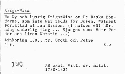 //// Krigs=Wisa //// En Ny och Lustig Krigs=Wisa om De Raska Bonde rne, som inte war rädda för Busen. Wälment Författad af Jan Ersson. Cl hafwen wäl hört mån g underlig ting ... Sjunges som: Herr Peder och liten Kerstin ...) //// Linköping 1808, tr. Groth och Petre 4 s. 8:0 //// 196 KB okat. Vitt. sv. milit. //// 1788-1834 ////