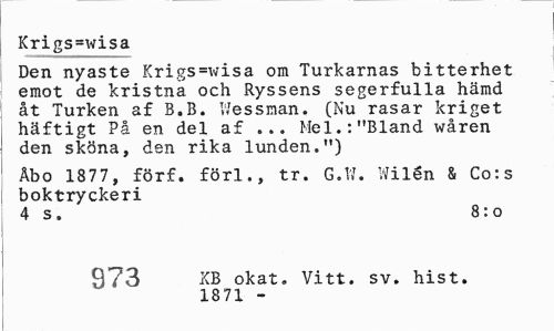 //// Krigs=wisa //// Den nyaste Krigs =v;isa om Turkarnas bitterhet emot de kristna och Ryssens segerfulla hämd åt Turken af B.B. Wessman. (Nu rasar kriget häftigt På en del af ... Mel.:"Bland wåren den sköna, den rika lunden.") //// Åbo 1877, förf. förl., tr. G.W. Wilén & Co:s boktryckeri //// 4 s. 8:0 //// 973 KB okat. Vitt. sv. hist. //// 1871 - ////