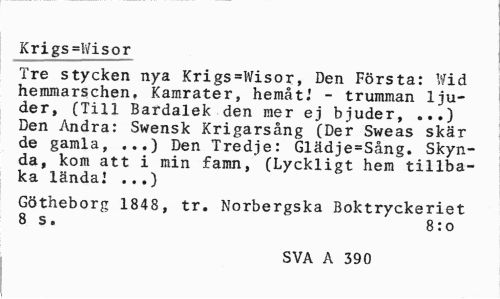 //// Krigs=Wisor //// Tre stycken nya Krigs=Wisor, Den Första: Wid hemmarschen, Kamrater, hemåt.' - trumman ljuder, (Till Bardalek den mer ej bjuder, ...) Den Andra: Swensk Krigarsång (Der Sweas skär de gamla, ...) Den Tredje: Glädje=Sång. Skynda, kom att i min famn, (Lyckligt hem tillbaka lända.' ...) //// Götneborg 1848, tr. Norbergska Boktryckeriet 8 s. 8:0 //// SVA A 390 ////