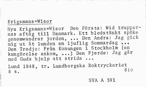 //// Krigsmans=Wisor //// Nya Krigsmans=Wisor Den Första: Wid truppernas aftåg till Danmark. Ett blodstänkt spöke genomwandrar jorden, Den Andra: Jag gick //// mig ut åt lunden en ljuflig Sommardag ... Den Tredje: Från Konungen i Stockholm (en kungörelse ankom, ...) Den Fjerde: Jag går med Guds hjelp att strida ... //// Lund 1848, tr. Lundbergska Boktryckeriet //// 8 s. 8:0 //// SVA A 391 ////