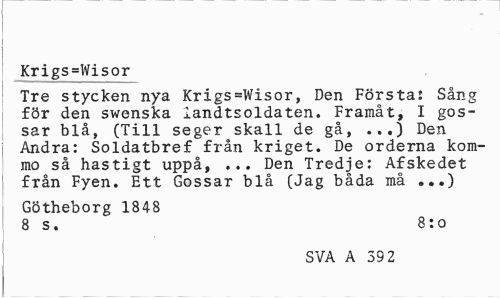 //// Krigs=Wisor //// Tre stycken nya Krigs=Wisor, Den Första: Sång för den swenska iandtsoldaten. Framåt, I gossar blå, (Till seger skall de gå, ...) Den Andra: Soldatbref från kriget. De orderna kom-mo så hastigt uppå, ... Den Tredje: Afskedet från Fyen. Ett Gossar blå (Jag båda må ...) //// Götheborg 1848 //// 8 s. 8:0 //// SVA A 39 2 ////