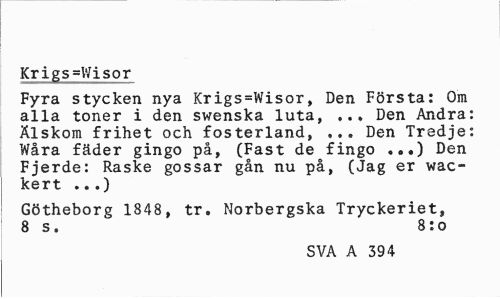 //// Krigs=Wisor //// Fyra stycken nya Krigs=Wisor, Den Första: Om alla toner i den swenska luta, ... Den Andra: Älskom frihet och fosterland, ... Den Tredje: Wåra fäder gingo på, (Fast de fingo ..«) Den Fjerde: Raske gossar gån nu på, (Jag er wac-kert ...) //// Götheborg 1848, tr. Norbergska Tryckeriet, 8 s. 8:0 //// SVA A 394 ////