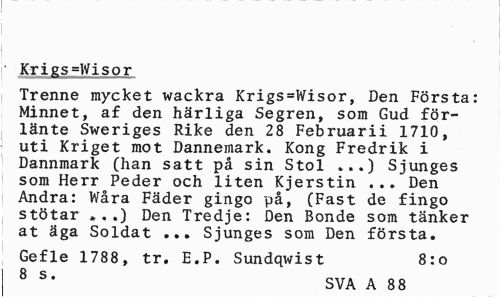 //// Krigs=Wisor //// Trenne mycket wackra Krigs=Wisor, Den Första: Minnet, af den härliga Segren, som Gud för-länte Sweriges Rike den 28 Februarii 1710, uti Kriget mot Dannemark. Kong Fredrik i Dannmark (han satt på sin Stol ...) Sjunges som Herr Peder och liten Kjerstin ... Den Andra: Wåra Fäder gingo på, (Fast de fingo stötar * . .) Den Tredje: Den Bonde som tänker at äga Soldat ... Sjunges som Den första. //// Gefle 1788, tr. E.P. Sundqwist 8:o //// 8 s* SVA A 88 ////