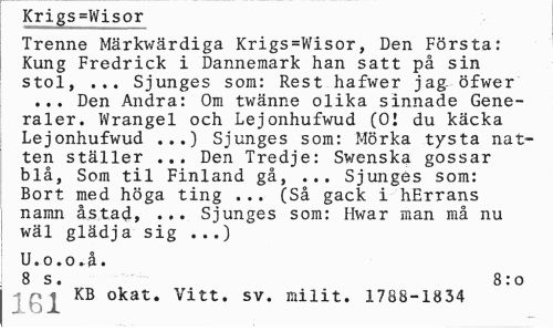 //// Krigs=Wisor //// Trenne Märkwärdiga Krigs=Wisor, Den Första: Kung Fredrick i Danneraark han satt på sin stol, ... Sjunges som: Rest hafwer jag- öfwer //// ... Den Andra: Om twänne olika sinnade Generaler. Wrangel och Lejonhufwud (0! du käcka Lejonhufwud ...) Sjunges som: Mörka tysta natten ställer ... Den Tredje: Swenska gossar blå, Som til Finland gå, ... Sjunges som: Bort med höga ting ... (Så gäck i hErrans namn åstad, ... Sjunges som: Hwar man må nu wäl glädja sig ...) //// U.o.o.å. //// 8 s. 8:0 //// | KB okat. Vitt. sv. milit. 1788-1834 ////