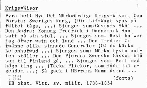 //// Krigs=Wisor 1 //// wrnBrnmmmlmmMmmmmmmmaMim* i //// Fyra helt Nya Och Märkwärdiga Krigs=Wisor, Den Första: Sweriges Kung, (Din Lif=Wagt syns på fältet tåga, ...) Sjunges som:Gustafs Skål ... Den Andra: Konung Fredrick i Dannemark Han satt på sin stol, ... Sjunges som: Rest hafwer jag öfwer watn och land ... Den Tredje: Om twänne olika sinnade Generaler (01 du käcka Lejonhufwud ...) Sjunges som: Mörka tysta natten ställer ... Den Fjerde: Swenska Gåssar blå som til Finland gå, ... Sjunges som: Bort med höga ting ... (Täcka Flickor, som fådt til e-gendom ...; Så gäck i HErrans Namn åstad .., //// IG 2 (forts) //// KB okat. Vitt. sv. milit. 1788-1834 ////