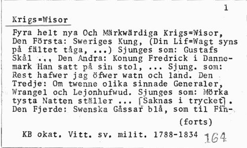 //// 1 //// Krigs=Wisor //// Fyra helt nya Och Märkwärdiga Krigs=Wisor, Den Första: Sweriges Kung, (Din Lif=Wagt syns på fältet tåga, ...) Sjunges som: Gustafs Skål v,, Den Andra: Konung Fredrick i Danne-mark Han satt på sin stol, ... Sjung, som: Rest hafwer jag öfwer watn och land. Den Tredje: Om twenne olika sinnade Generaler, Wrangel och Lejonhufwud. Sjunges som: Mörka tysta Natten ställer ... [Saknas i trycket! . Den Fjerde: Swenska Gåssar blå, som til Fin- //// (forts) //// KB okat. Vitt. sv. milit. 1788-1834 ////