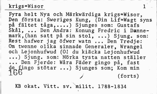 //// krigs=Wisor 1 //// Fyra helt Nya och Märkwärdiga krigs=Wisor, Den första: Sweriges Kung, (Din Lif=Wagt syns på fältet tåga,...) Sjunges som: Gustafs Skål, ... Den Andra: Konung Fredric i Danne-mark,(han satt på sin stol, ...) Sjung, som: Rest hafwer jag öfwer watn ... Den Tredje: Om twenne olika sinnade Generaler, Wrangel och Lejonhufwud (OJ du kiäcka Lejonhufwud ...) Sjung, som: Mörka tysta natten ställer ... Den Fjerde: V/åra Fäder gingo på, fast de fingo stötar ...) Sjunges som; Kom min //// 1Gb J (forts) //// KB okat. Vitt. sv. milit. 1788-1834 ////