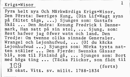 //// Krigs=Wisor 1 //// Fyra helt nya Och Märkwärdiga Krigs=Wisor, Den Första: Sweriges Kung, (Din Lif=Wagt syns på^fältet tåga, ...) Sjunges som: Gustafs Skål ... Den Andra: Konung Fredrick i Danne-mark, Han satt på sin stol, ,... Sjung, som: Rest hafwer jag öfwer watn och land. Den Tredje: Om twenne olika sinnade Generaler. Wrangel och Lejonhufwud, ... (0! du käcka Lejonhufwud ...) Sjunges som: Mörka tysta natten ställer ... Den Fjerde: Swenska Gåssar blå, som til Finland gå, ... Sjunges som: Bort med höga ting ... (Täcka Flickor, som fådt til //// 1G9 (forts) //// KB okat. Vitt. sv. milit. 1788-1834 ////