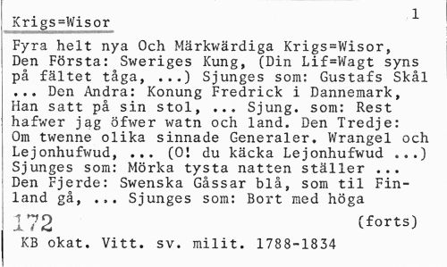//// Fyra helt nya Och Märkwärdiga Krigs=Wisor, Den Första: Sweriges Kung, (Din Lif=Wagt syns på fältet tåga, ...) Sjunges som: Gustafs Skål ... Den Andra: Konung Fredrick i Dannemark, Han satt på sin stol, ... Sjung, som: Rest hafwer jag öfwer watn och land. Den Tredje: Om twenne olika sinnade Generaler. Wrangel och Lejonhufwud, ... (01 du käcka Lejonhufwud ...) Sjunges som: Mörka tysta natten ställer ... Den Fjerde: Swenska Gåssar blå, som til Finland gå, Sjunges som: Bort med höga //// 172 (£orts) //// KB okat. Vitt. sv. milit. 1788-1834 ////