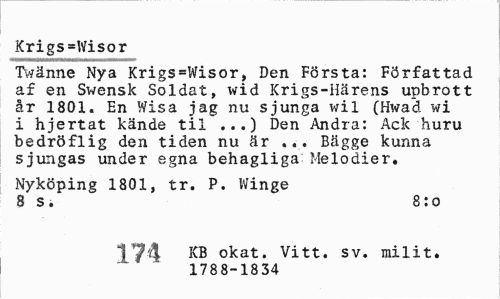 //// Krigs=Wisor //// Twänne Nya Krigs=Wisor, Den Första: Författad af en Swensk Soldat, wid Krigs-Härens upbrott år 1801. En Wisa jag nu sjunga wil (Hwad wi i hjertat kände til ...) Den Andra: Ack huru bedröflig den tiden nu är ... Bägge kunna sjungas under egna behagliga Melodier. //// Nyköping 1801, tr. P. Winge 8 s. 8:o //// 174 KB okat. Vitt. sv. milit. //// 1788-1834 ////
