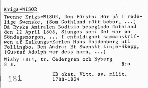 //// Krigs =WISOR //// Twenne Krigs=WISOR, Den Första: Hör på I rede-lige Swenske, (Som Gothland rätt bebor, ,..) Då Ryska Amiralen Bodisko beseglade Gothland den 22 April 1808, Sjunges som: Det war en Söndagsmorgon, ... I enfaldighet sammanskrif- //// t.rA*» n -C Fn 1 Vim -l^n vi Unrv r Un 4 /lawkpr nr 11 "t" ~1 //// wtn x ivcxxxvciii^o —ivcijl x nauj uaj uuuUvl g U L. x //// Follingbo. Den Andra: Et Swenskt Linje=Skepp, (Gustaf Adolph v/ar dess namn, ...) //// Wisby 1814, tr. Cedergren och Nyberg 8 s. 8:o //// KB okat. Vitt. sv. milit. //// 181 1788-1834 ////