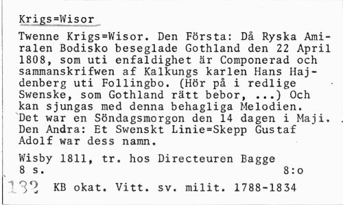 //// Krigs=Wisor 1 //// Twenne Krigs=Wisor. Den Första: Då Ryska Amiralen Bodisko beseglade Gothland den 22 April 1808, som uti enfaldighet är Componerad och sammanskrifwen af Kalkungs karlen Hans Haj-denberg uti Follingbo. (Hör på i redlige Swenske, som Gothland rätt bebor, ...) Och kan sjungas med denna behagliga Melodien. "Det war en Söndagsmorgon den 14 dagen i Maj i. Den Andra: Et Swenskt Linie=Skepp Gustaf Adolf war dess namn. //// Wisby 1811, tr. hos Directeuren Bagge 8 s. 8:o //// KB okat. Vitt. sv. milit. 1788-1834 ////