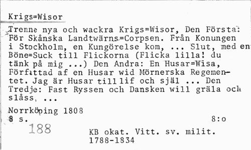 //// Krigs=Wisor //// JTrenne nya och wackra Krigs=Wisor, Den Första: För Skånska Landtwärns-=Corpsen. Från Konungen i Stockholm, en Kungörelse kora, ... Slut, med en Böne=Suck till Flickorna (Flicka lilla! du tänk på mig ...) Den Andra: En Husar=Wisa, Förfittad af en Husar wid Mörnerska Regementet. Jag är Husar tilllif och själ ... Den Tredje: Fast Ryssen och Dansken will gräla och slåss, ... //// Norrköping 1808 //// 8 s. 8:0 //// 188 KB okat. Vitt. sv. milit. //// 1788-1834 ////