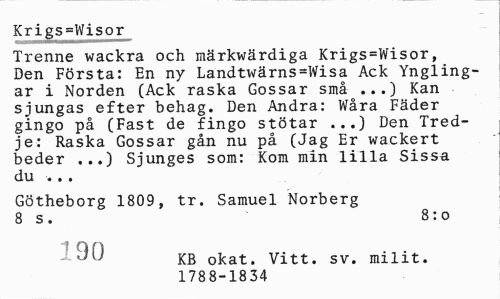 //// Krigs=Wisor //// mmKrnmSmmmmrnmamammmmmmm //// Trenne wackra och märkwärdiga Krigs=Wisor, Den Första: En ny Landtwärns^Wisa Ack Ynglingar i Norden (Ack raska Gossar små ...) Kan sjungas efter behag. Den Andra: Wåra Fäder gingo på (Fast de fingo stötar ...) Den Tredje: Raska Gossar gån nu på (Jag Er wackert beder ...) Sjunges som: Kom min lilla Sissa du ... //// GÖtheborg 1809, tr. Samuel Norberg 8 s. 8:0 //// KB okat. Vitt. sv. milit. //// 1788-1834 ////