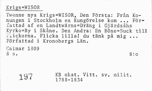 //// Krijs=WISOR //// Twenne nya Krigs=WISOR, Den Första: Från Konungen i Stockholm en Kungörelse kom ... Författad af en Landtwärns=Dräng i Gjärdsåhs Kyrko=By i Skåne. Den Andra: En Böne=Suck till Ij-ickorna. Flicka lilla.1 du tänk på mig ... Författad i Kronobergs Län. //// Calmar 1809 //// 8 s. 8: o //// -t an KB okat. Vitt. sv. milit. //// -10' 1788-1334 ////