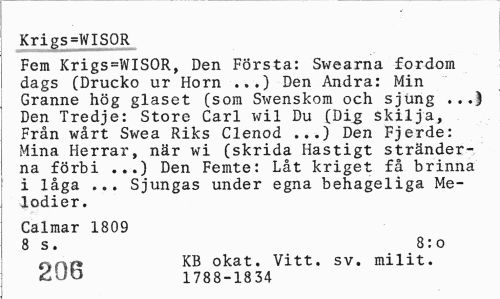 //// Krigs=WISOR //// Fem Krigs=WISOR, Den Första: Swearna fordom dags (Drucko ur Horn ...) Den Andra: Min Granne hög glaset (som Swenskom och sjung ...) Den Tredje: Store Carl wil Du (Dig skilja, Från wårt Swea Riks Clenod ...) Den Fjerde: Mina Herrar, när wi (skrida Hastigt stränderna förbi ...) Den Femte: Låt kriget få brinna i låga ... Sjungas under egna behageliga Melodier. //// Calmar 1809 //// 8 s. 8:0 //// e%r\r* KB okat. Vitt. sv. milit. //// 1788-1834 ////