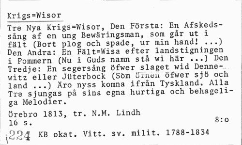 //// Krigs=Wisor //// ¦ Tre Nya Krigs=Wisor, Den Första: En Afskeds-sång af en ung Bewäringsman, som går ut i fält (Bort plog och spade, ur min hand! .,.) Den Andra: En Fält=Wisa efter landstigningen i Pommern (Nu i Guds namn stå wi här ...) Den Tredje: En segersång öfwer slaget wid Denne-, witz eller Juterbock (Söm ömen öfwer sjö och land ...) Äro nyss komna ifrån Tyskland. Alla Tre sjungas på sina egna hurtiga och behageliga Melodier. //// Örebro 1813, tr. N.M. Lindh //// 16 s. 8:0 //// '>224 KB okat* vitt- sv- milit. 1788-1834 ////