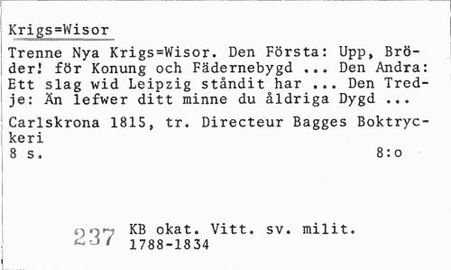 //// Trenne Nya Krigs=Wisor. Den Första: Upp, Broderi för Konung och Fädernebygd ... Den Andra: Ett slag wid Leipzig ståndit har ... Den Tredje: Än lefwer ditt minne du åldriga Dygd ... //// Carlskrona 1815, tr. Directeur Bagges Boktryckeri //// 8 s. 8:0 //// jn KB okat. Vitt. sv. milit. //// ' ' 1788-18 34 ////