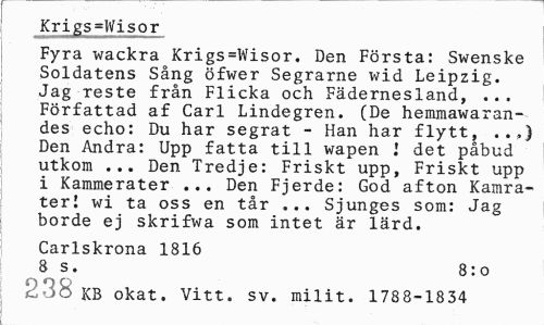 //// Fyra wackra Krigs=Wisor, Den Första: Swenske Soldatens Sång öfwer Segrarne wid Leipzig. Jag reste från Flicka och Fädernesland, ... Författad af Carl Lindegren. (De hemmawaran-des echo: Du har segrat - Han har flytt, ..,) Den Andra: Upp fatta till wapen .* det påbud utkom ... Den Tredje: Friskt upp, Friskt upp i Kammerater ... Den Fjerde: God afton Kamrater! wi ta oss en tår ... Sjunges som: Jag borde ej skrifwa som intet är lärd. //// Carlskrona 1816 //// 8 s. 8:0 //// 238 KB okat. Vitt. sv. milit. 1788-1834 //// « ////