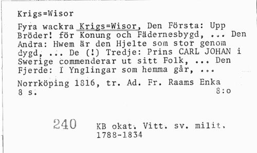 //// Krigs=Wisor //// Fyra wackra Krigs=Wisor, Den Första: Upp Bröder! för Konung och Fädernesbygd, ... Den Andra: Hwem är den Hjelte som stor genom dygd, ... De (!) Tredje: Prins CARL JOHAN i Swerige commenderar ut sitt Folk, ... Den Fjerde: 1" Ynglingar som hemma går, ... //// Norrköping 1816, tr. Ad. Fr. Raams Enka 8 s. 8:o //// 240 KB okat. Vitt. sv. milit, //// 1788-1834 ////
