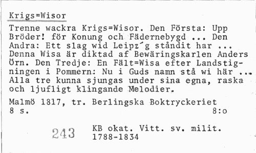 //// Krigs-Wisor //// Trenne wackra Krigs=Wisor. Den Första: Upp Broderi för Konung och Fädernebygd ... Den Andra: Ett slag wid Leipzig ståndit har ... Denna Wisa är diktad af Bewäringskarlen Anders örn. Den Tredje: En Fält=Wisa efter Landstigningen i Pommern: Nu i Guds namn stå wi här . Alla tre kunna sjungas under sina egna, raska och ljufligt klingande Melodier. //// Malmö 1817, tr. Berlingska Boktryckeriet //// 8 s. 8:0 //// O «n KB okat. Vitt. sv. milit. //// (Z<lä 1788-18 34 ////