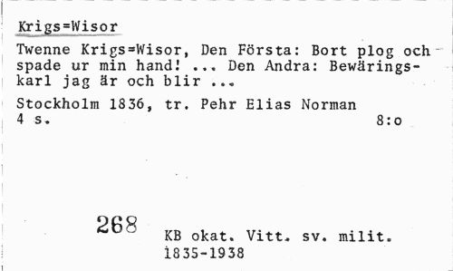 //// Krigs=Wisor //// Twenne KrigssWisor, Den Första: Bort plog och spade ur min handJ ... Den Andra: Bewärings-karl jag är och blir ... //// Stockholm 1336, tr. Pehr Elias Norman 4s. 8:0 //// I j //// I //// finC KB okat. Vitt. sv. milit. //// 1835-1938 ////
