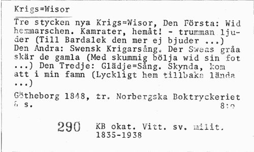 //// Krigs=Wisor //// Tre stycken nya Krigs=Wisor, Den Första: Wid hemmarschen. Kamrater, hemåt I - trumman ljuder (Till Bardalek den mer ej bjuder »..) Den Andra: Swensk Krigarsång^ Der Sweas gråa skär de gamla (Med skummig bölja wid sin fot ...) Den Tredje: Glädje=Sång. Skynda, kom att i min famn (Lyckligt hem tillbaka lända //// Götheborg 1848, tr. Norbergska Boktryckeriet //// r, s. 8:0 //// 290 KB okat. Vitt. sv. milit. //// 1835-1938 ////