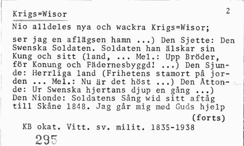 //// 2 //// Krigs=Wisor //// Nio alldeles nya och wackra Krigs=Wisor; //// ser jag en aflägsen hamn ...) Den Sjette: Den Swenska Soldaten. Soldaten han älskar sin Kung och sitt (land, ... Mel.: Upp Bröder, för Konung och Fädernesbyggd! ...) Den Sjunde: Herrliga land (Frihetens stamort på jorden ... Mel.: Nu är det höst ...) Den Åttonde: Ur Swenska hjertans djup en gång . ..) Den Nionde: Soldatens Sång wid sitt aftåg till Skåne 1848. Jag går mig med Guds hjelp //// (forts) //// KB okat. Vitt. sv. milit. 1835-1938 //// 29F ////