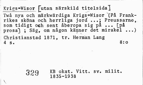 //// Krigs^Wisor £utan särskild titelsida3 //// Twå nya och märkwärdiga Krigs=Wisor "(På Frankrikes sköna och herrliga jord ...; Preussarne, som tidigt och sent åberopa sig på ... [på prosa™] ; Säg, om någon känner det mirakel ...) //// Christianstad 1871, tr. Herman Lang 4 s. 8:0 //// finC KB okat. Vitt. sv. milit. //// 1835-1938 //// \ ////
