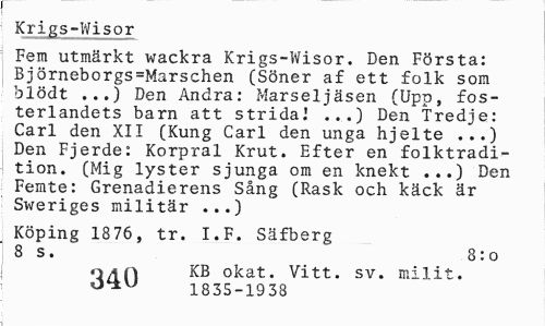//// Krigs=Wisor //// Fem utmärkt wackra Krigs-Wisor. Den Första: Björneborgs»Marschen (Söner a£ ett folk som blödt ...) Den Andra: Marseljäsen (Upp, fosterlandets barn att strida! ...) Den tredje: Carl den XII (Kung Carl den unga hjelte ...) Den Fjerde: Korpral Krut. Efter en folktradition. (Mig lyster sjunga om en knekt ...) Den Femte: Grenadierens Sång (Rask och käck är Sweriges militär ...) //// Köping 1876, tr. I.F. Säfberg 8 s. 8:o //// o a n KB okat. Vitt. sv. milit. 1835-1938 ////