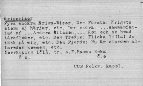 //// Pyra^acfra Kriss-Wigerf Der Första. Krigets storm ej härjar,, etc. Den Andra .^sammanfattad af ...Anders Uilsson,..» Kom och se hwad taref 1 od er, etc Den Tredje; Flicka lilla! du tänk mii?:, etc. Den Fjerde; Nu är sturden allaredan kommen, etc, Norrköping 1?13, tr, A.F.Raams Enka P s. 8; o //// UUB FclkT, kapsi. ////