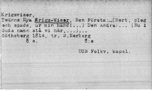 //// Krigsvisor, //// TwUnne Hy a grlgg-Wis»r. Den Första:«4Bort, plog och spade, ur rain^Kjmd!.,. j Den Andra:... (Nu 1 Gud a namn sta v.i har Götheborg 1814, tr. S.Norberg 8a. 8,0 //// UUB Folkv. kapsl, ////