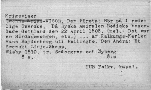 //// Krigövi sor //// . ¦pwr.V;)||HiutÉyy hSoWISOR^ Der Första; Kör pä I rede-lige Swerske, Då Hyska Amiralen Bodisko beseglade Gothland den 22 April 1808, (mel.: Det war en Söndagsmorgon, etc,) ... af Kalkungs-Karlen Hans Hajdehberg uti Follingbo. Den Andra: Et Swenskt Linje-Skepp, //// Wisby I8l0, tr. Sedergren och Nyberg 8 s, 8; o //// UUB Folkv» kapsl, ////