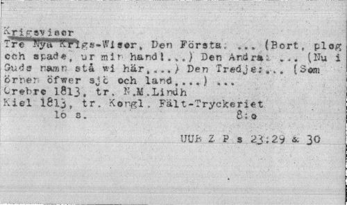 //// Kri £avi aer //// Tre' r KjJrÄHCFtga-Wl ser, Den Första, ... (Bort, plog cch spade, ur mir hand!.».) Den And ra i ... (Du i Suds namn stå *i här,.../ Den Tredje;... (Sém örnen öfwer sjc och land,...) ... Crebre 1813, tr. KJi.Lindh Kiel 1813, tr. Kongl. Fält-Tryckeriet lo s. 8;o //// UUB Z P s 2j; 29 & 30 ////