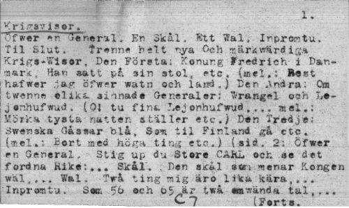 //// 1. //// Kr i/revisor, //// "öfwer ir "Gener-il". En Skål. Ett Wal. Irpromtu. Til Slut. trenna helt nya Och märkwärdis* Krigs-Wisor, Den Första: Konur.g fredrich i Pan-naa r<,. Han satt på sin stol, etc. (mel,: Rest hafwer .jag öfwrr watn och land.) Den .\ndra: Om twenne elikä. sinnade Generaler: krångel osh Lejonhufwud, (01 tu fina Lejonhufwud..,, mel,: Mot i: a tysta natten ställer etc.) Den Tredje: Swenska Gassar blå, Sam til Finland gå etc. (mel.: Bort med hög» tiffci etc.) (sid. 2: öfwer en General. Stig up du Store CÅhL och se det fordna Kike:... Skål. . Den sKal scri menar Kongen wäl,... Wal. Trlk ting mig är o lika kära,... Inpromtu. Sm och o5 är twå emwända tal,... //// C 1 (Parts. ////