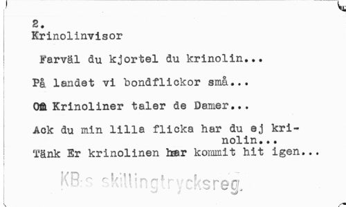 //// vi. //// 2. //// Krinolinvisor //// Farväl du kjortel du krinolin... //// På landet vi bondflickor små... //// Oft Krinoliner tåler de Damer... //// Ack du min lilla flicka har du ej krinolin. .. //// Tänk Er krinolinen baar kommit hit igen... //// i //// KB:5 ^killing*rycksreg. ////