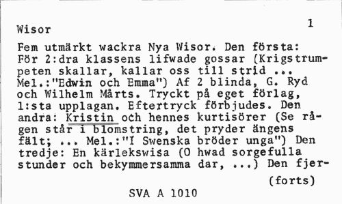 //// Wisor 1 //// Fem utmärkt wackra Nya Wisor. Den första: För 2:dra klassens lifwade gossar (Krigstrumpeten skallar, kallar oss till strid ... Mel.:"Edwin och Emma") Af 2 blinda, G. Ryd och Wilhelm Mårts. Tryckt på eget förlag, l:sta upplagan. Eftertryck förbjudes. Den andra: Kristin oCh hennes kurtisörer (Se rågen står i blomstring, det pryder ängens fält; Mel.:"l Swenska bröder unga") Den tredje: En kärlekswisa (0 hwad sorgefulla stunder och bekymmersamma dar, ...) Den fjer- //// (forts) //// SVA A 1010 ////