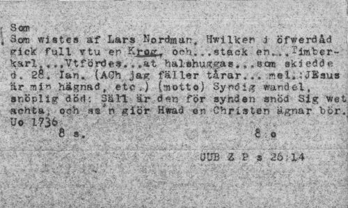 //// • SOT'. ¦ '.". //// , 3 om wistes af Lars Nordman. Hwilker i öfwerdåd £ick full vtu ** Kj»fur, orh...stack en.,.,Timber-knrl .. ,Vt förde». , .at halshuggas...»era sk i ed de d. 20. lan. (AGh jag fäller t&rar. .. mel.:JEsus är min hägnad, etc,) (motto) Syndig wandel, snöplig död: Säll är den för synden snöd Sig v/et achta, och ss'n giör Hwad en Christen ägnar hör. U© 1736^ //// 8 s. £ o //// UUB 2 P 5 26.14 //// 'T • ' 'V- ' .V "öt'/. ' -'¦'i' ¦ 1 ' •/.. ¦' . . //// v . '" . >. -» '- ' , ,. ... ..' //// •t" '* ' v if*"" •¦vr* Ä'. '^'f'f"/' y >'v*j '"^a "«!* "v <•'.<>''•.* • iv • wlf '- t • " *.: .tY*'• '4'"4 '.-V //// •V " A- .. - ' i' • V>* K' • •.. • ' ' —' . . •- : -' . . / ////