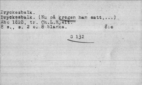 //// Dryckesbalk. //// Dryckesbalk. (Nu på krcgen han satt,...) Åbo 1826, tr. Ch.L.HjelTT 8 s., s. 2 o. 8 blanka. 8;o //// a 132 ////